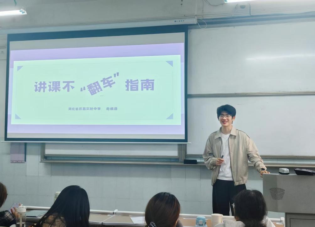 2022级研究生学长肖迪涵受邀返校,为2023级本科生开展优秀教师成长专题讲座。他以“讲课不‘翻车’指南”为主题,从内容、选题、备课等维度分享教学心得,助力师范生筑牢教学基本功。